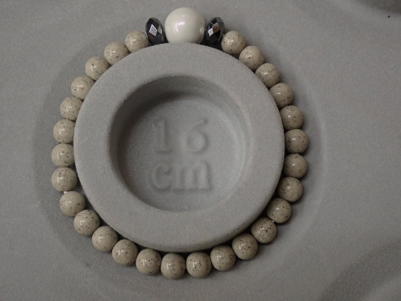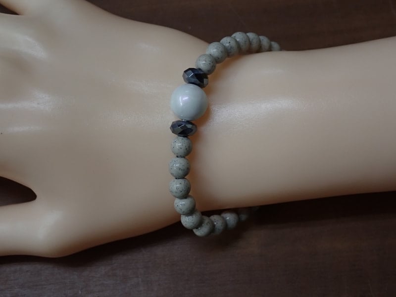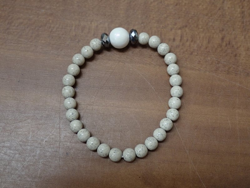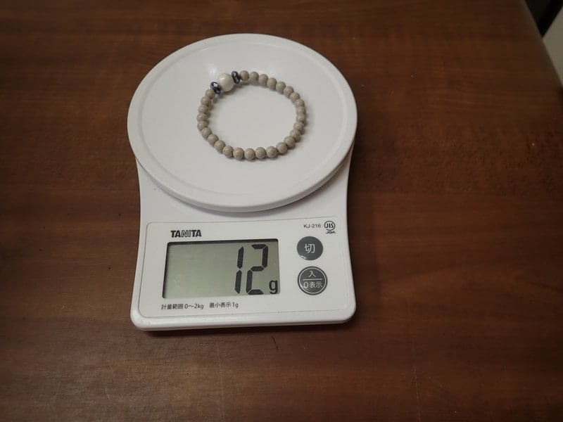6mm玉で、玉川温泉産10ミリ1玉+台湾産27玉+テラヘルツのコラボとなります。重さ12g、サイズは手首15から16cmまで、線量5.696μSv/hrとなります。手首が太い方などまたは細い方はご相談ください。