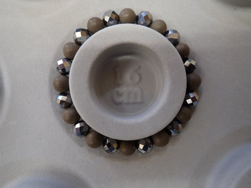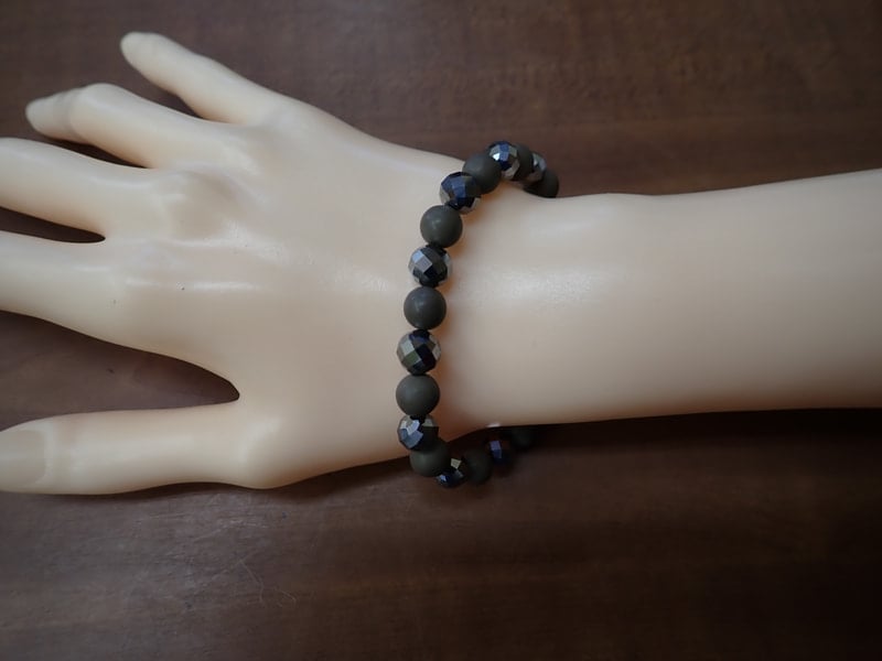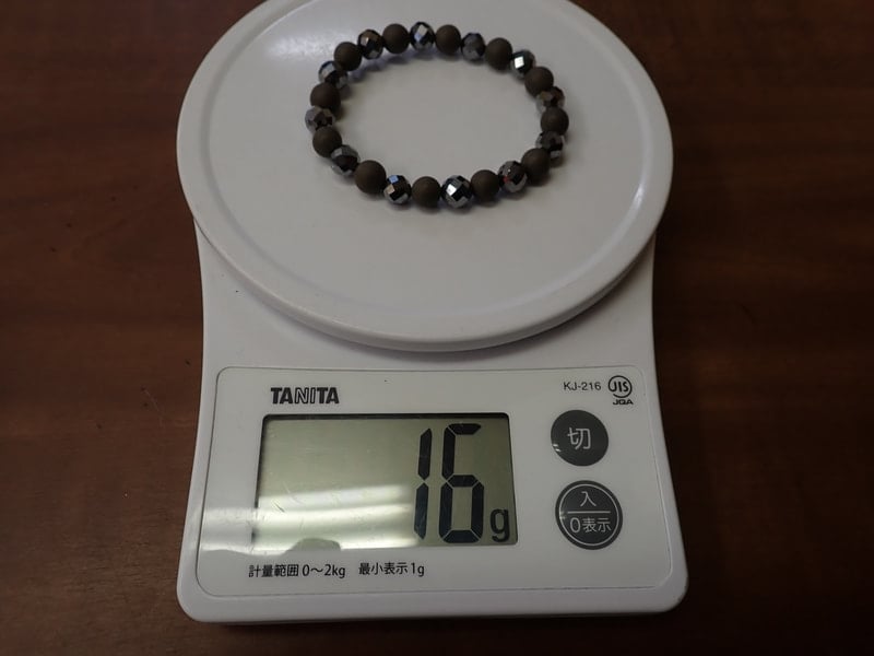 8mm玉で玉川温泉産12玉、テラヘルツ64面カット12玉 重さ16g、サイズは手首16cmまで、線量11.88μSv/hrとなります。色はブラック、シルバー