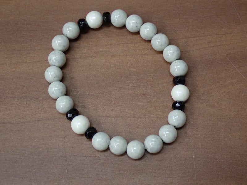 8mm玉で、玉川温泉産3玉イエローパール+台湾産18玉+オニキスのコラボとなります。重さ17g、サイズは手首16cmまで、線量7.006μSv/hrとなります。