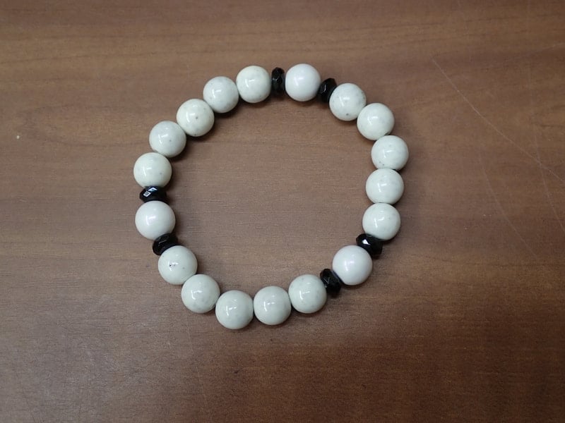 10mm玉で、玉川温泉産スーパーパールホワイト3玉+台湾産15玉のコラボとなります。重さ31g、サイズは手首17cmまで、線量10.43μSv/hrとなります。