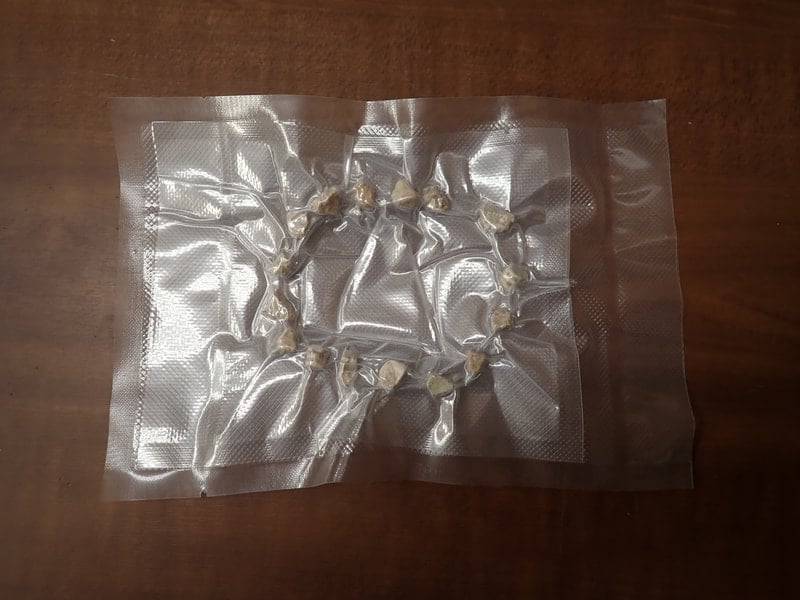 北投石真空パックシートは、小粒で、形状も線量も適した北投石を入荷する必要があるため、大変希少な商品となります。また、自然鉱石の組み合わせのため一つとして同じものはなく、一点もののとなります。こちらは、玉川温泉北投石、重さ23g、線量6.771 μSv/hrとなります。ひざ、乳などに