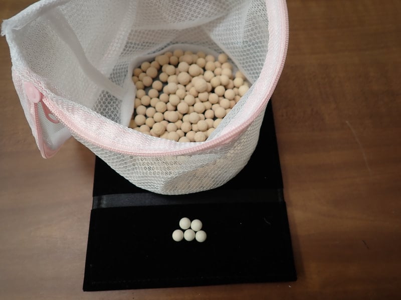 北投石の粉黛にセラミックを混ぜて焼成した、単体でも十分な線量を計測し北投石としての鑑別結果も頂いた「北投石ボール」と、玉川温泉の湯の花とセラミックを混ぜて焼成した、微量なラジウムを発する「岩盤ボール」が入っています。こちらは、北投石ボール8mm5個+岩盤ボールで約100gとなります。