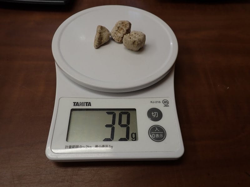 重さ39g、線量5.546μSv/hr、北投石3個のセットとなります。